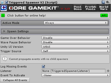 - Listener: Here you can drag in a TriggeredSpawnerListener to hook into key events and do customized coding. For more about Listeners go here.